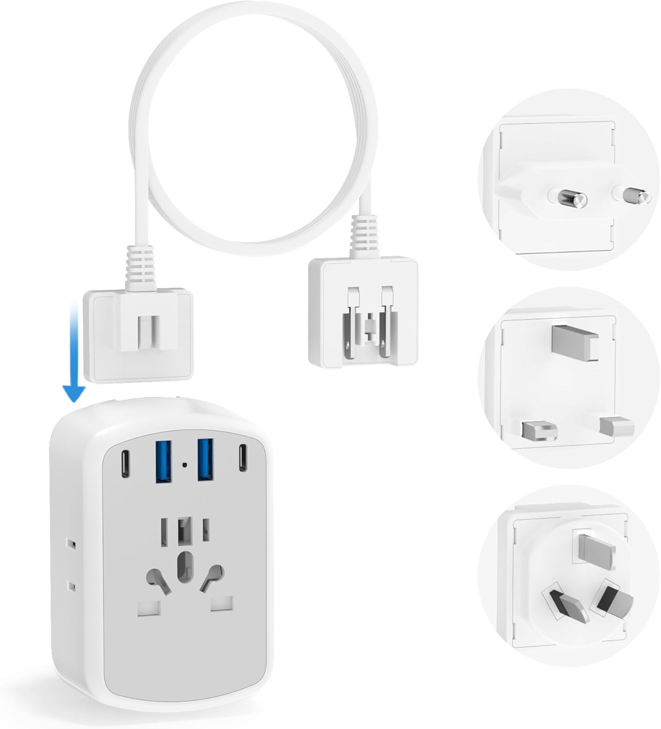 Universal Travel Adapter, Type A/C/G/I Plug Adapter, 5ft Detachable Extension Cord, 3 AC Outlets, 4 USB Ports (2 USB C), UK Europe Australia International Power Adapter